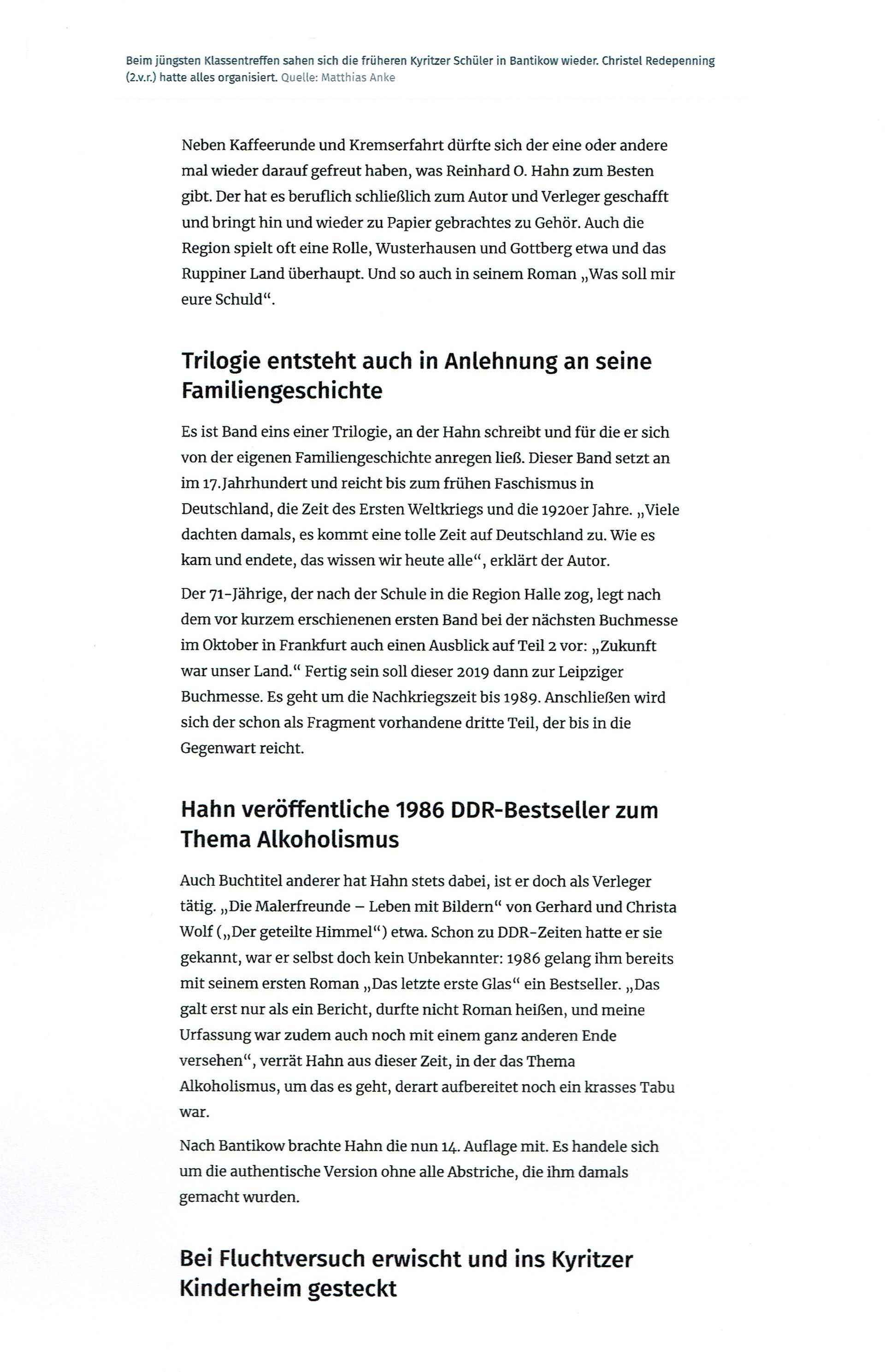 „Bis dahin bin ich bestimmt auch mal wieder in der Region und veranstalte eine Lesung“, verspricht Hahn, der den Draht in die alte Heimat nie verlor. Denn jene, die 1964 in Kyritz die damalige Wilhelm-Pieck-Schule verließen, schafften es bisher, sich alle zwei Jahre dort wiederzusehen.