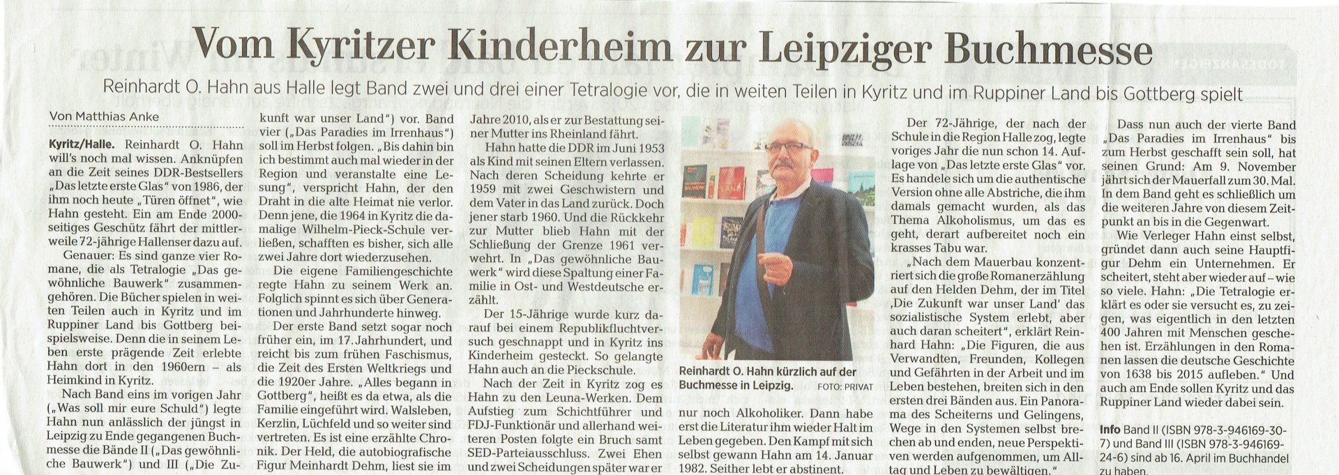 Genauer: Es sind ganze vier Romane, die als Tetralogie „Das gewöhnliche Bauwerk“ zusammengehören. Die Bücher spielen in weiten Teilen auch in Kyritz und im Ruppiner Land bis Gottberg beispielsweise. Denn die in seinem Leben erste prägende Zeit erlebte Hahn dort in den 1960ern – als Heimkind in Kyritz.