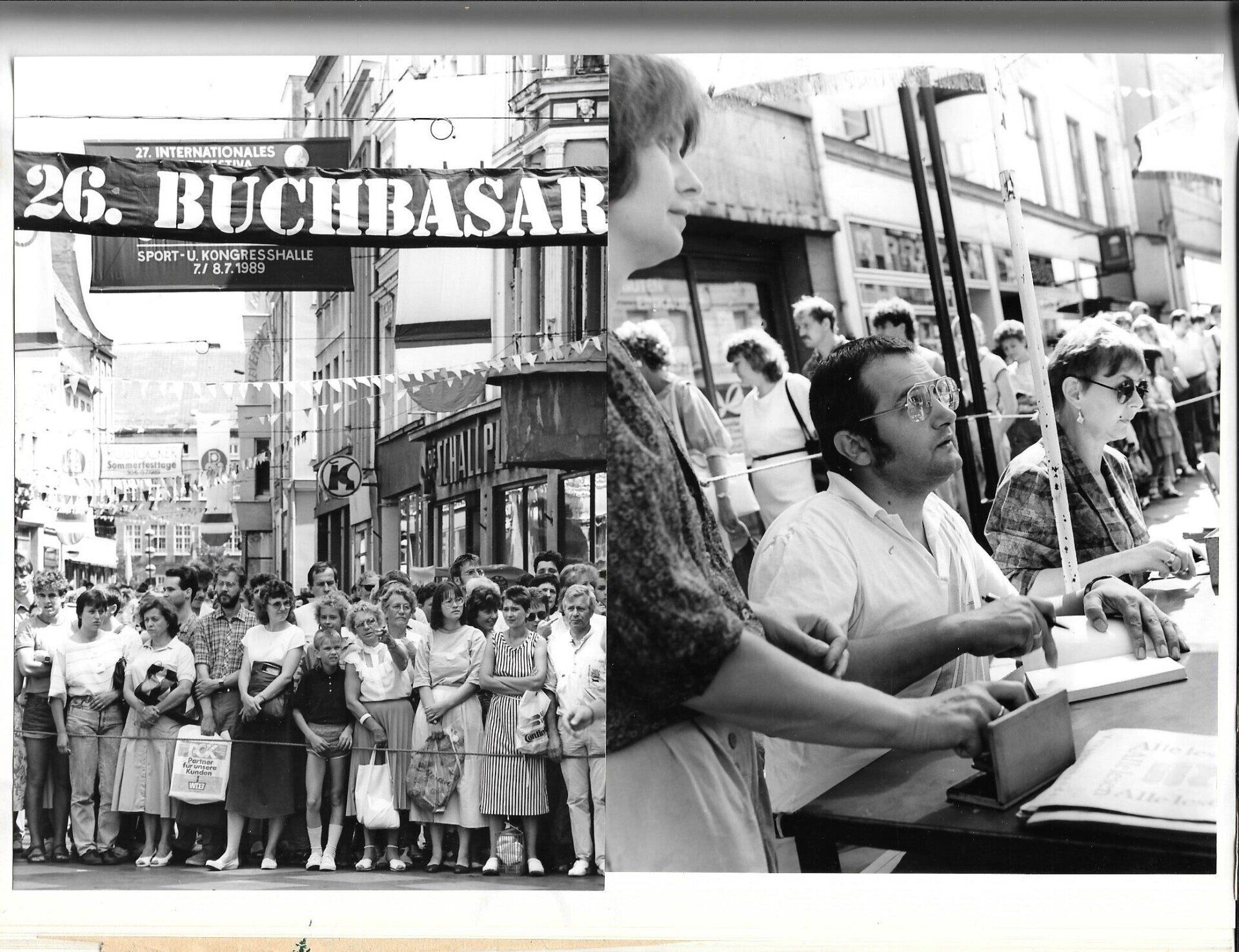 Rechts das Foto in Rostock. Es war unglaublich, 800 Bücher (!) in etwa zehn Stunden signiert. Fünf Damen haben mir geholfen, zu stempeln, zu kassieren, zu signieren, einzupacken und zu überreichen. Ein Stempel mit dem Hahn, den mir KDL gemacht hatte, schaffte zusätzlich eine freundliche Atmosphäre.